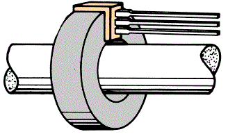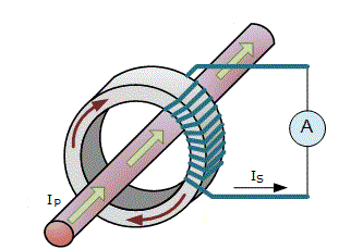 כך פועל חיישן הזרם למדידת זרם חילופין. הליבה המגנטי בצורה של צבת סגור סביב המוליך. מוליך הוא סליל ראשוני המורכב מסיבוב אחת בה יש לדעת את ערך הזרם
