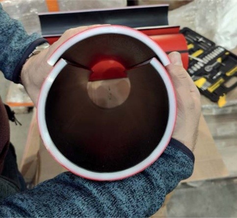 • אז מציע עוד פתרון (הפתרון המתקדם): שיטה זו מניחה שהצינורות מיוצרים בתחילה במפעל משני חלקים אורכיים המחוברים באמצעות מערכת צירים ומאובטחים יחד באמצעות מערכת נעילה. חשוב לציין, שהצינור חלק מבפנים, בעוד שלפניו החיצוניים יש צלעות הקשחה הממוקמות לרוחב הציר, מה שמעניק לצינור מראה הדומה לצינור קוברה סטנדרטי. צלעות אלו, יחד עם התותבים הממוקמים על האוגן האורכי של הצינור, מגבירות משמעותית את החוזק, ומאפשרות דירוג קשיחות טבעת גבוה.
